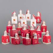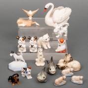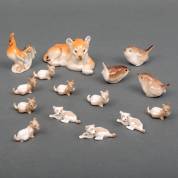 Drie porseleinen winterkoninkjes, haan, leeuwenwelpje, en tien miniatuur speelgoedhondjes, uitvoering Lomonosov, USSR