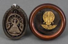 Verguld messing zakhorlogedeel met ajourgezaagd kruisigingsdecor, 18e eeuw, in mahonie lijst, daarbij: metalen hanger: Maria, in metalen striklijstje, Ø 8 cm