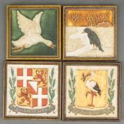 Vier cloisonné reliëftegels: gans, kraai, stadswapen 's Gravenhage, en stadswapen Utrecht, alle uitvoering De Porceleyne Fles, Delft, circa 1930, 12 x 12 cm