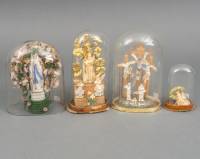 Vier altaarstukken onder glazen stolpen, diverse materialen, staande op houten basementen -één basement manco-