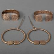 Paar 2e gehalte zilveren Berber stijgbeugels met visdecor, gewicht 569 gram, en paar metalen Berber dekenspelden met visdecor, Noord-Afrika