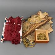 Tapisserie vermaakt tot stoelbekleding, 17e eeuw, rood wollen meubelband, 20e eeuw, en verguld bronzen meubelbeslag, midden 18e eeuw