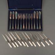 Twaalf verzilverde fruitmesjes met parelmoer heften, daarbij: zespersoons verzilverd visbestek, Cristofle, in cassette