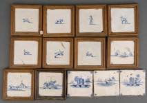 Dertien Delfts aardewerk tegels met blauw-witte decors: dieren, landschappen, en één figuur, 18e/19e eeuw -één tegel gelijmd, alle gebruikssporen-, 12 x 12 cm