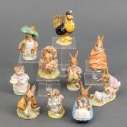 Tien keramische Beatrix Potter-figuren: 'Mr. Benjamin Bunny', 'Benjamin Bunny', 'Poorly Peter Rabbit', 'Mrs. Ribby', 'Sally Henny Penny', 'Benjamin Bunny Sat on a Bank', 'Mr. Benjamin Bunny and Peter Rabbit', 'Mrs. Rabbit and Bunnies', 'Miss Moppet', en 'Thomasina Tittlemouse', alle uitvoering John Beswick, Royal Doulton, Engeland, 11 cm