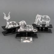 Drie geslepen kristallen beeldjes uit de serie 'Inspiratie Afrika': olifant, jaarstuk 1993, koedoe, jaarstuk 1994, leeuw, jaarstuk 1995, en een bijhorende geslepen kristallen plaquette met opschrift 'SCS Inspiratie Afrika 1993-1995', alle uitvoering Swarovski, inclusief originele verpakkingen en authenticiteitscertificaten, daarbij: drie zwarte basementen, waarvan twee met verpakking, 8,5 cm