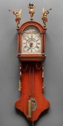 Friese staartklok met meekrapkleurige eiken kast, de wijzerplaat met schildering van visser aan het water, adres J. Brulee, Nieuwvliet, 19e eeuw, 125 x 37 x 20 cm