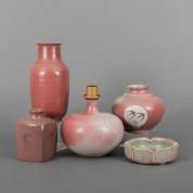 Siete Koch (hedendaags), paarsgeglazuurde keramiek vaas, groen-paarsgeglazuurde bolle vaas en asbak, rood-grijsgeglazuurde aardewerk lampvoet en vierkante paarsgeglazuurde vaas met craquelédecor, uitvoering Koch, Workum