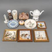 Divers aardewerk en porselein, waaronder: polychroom beschilderde dekschaal, divers Delfts, en theepot op theelicht, daarbij: glazen vaasje