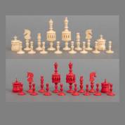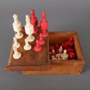 Benen schaakspel in rood en wit, 19e eeuw -compleet en intact-, 8 x 20 x 14 cm