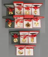 Dertien vergulde messing kerstdecoraties, jaaruitgaven 1996 tot en met 2008, uitvoering Georg Jensen, Denemarken, alle in originele verpakkingsdozen, 12 cm