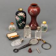 Twee Chinese snuifflesjes, odeurflacons met zilveren monturen, cloisonné vaasje, etc. -kleine defecten-