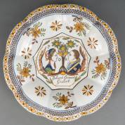 Aardewerk plooischotel met polychroom decor: Willem V en Wilhelmina van Pruisen bij oranjeboom met daaronder: 'Gehoont Gesmaat Gesart', circa 1900, 6,5 x Ø 34,5 cm