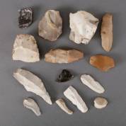 Verzameling archeologische artefacten, bestaande uit kernen, afslagen en klingen van vuursteen, obsidiaan en kwarts, middenpaleolithicum en neolithicum