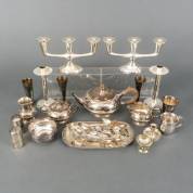 Divers verzilverd, waaronder kandelaars en theepot met roomstel