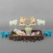 Diverse messing en Chinees porseleinen beeldjes etc., op dienblad