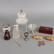 Geslepen dekselglas op schaaltje, met 2e gehalte zilveren knop, inktpot met 2e gehalte zilveren dop, verzilverd eierdopje, presse-papier, doosjes, etc. -defecten-, 13 cm