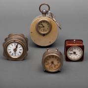 Drie diverse wekkertjes en een nachtwakersklok met sleutels
