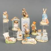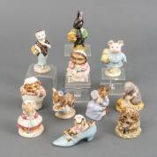 Tien keramische Beatrix Potter-figuren: 'Mr. Tod', 'Peter in the Gooseberry Net', 'Benjamin Wakes Up', 'Mrs. Rabbit Cooking', 'Mittens and Moppet', 'Hunca Munca spills the beads', 'Peter with Postbag', 'Johnny Town-Mouse with a Bag', 'Miss Dormouse', 'Peter and the Red Pocket Handkerchief', alle uitvoering Royal Albert, Engeland, één originele verpakking aanwezig