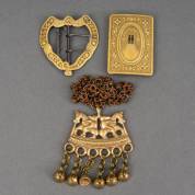 Twee metalen gedamasceerde gespsluitingen, mogelijk Toledo, daarbij: messing etnografische hanger aan koperen ketting, 6,5 x 4,5 cm