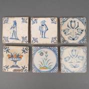Zes aardewerk tegels: polychroom bloemdecor, polychroom fruitmanddecor, twee met blauw-wit bloemdecor, en twee met blauw-witte figuren, alle tweede kwart 17e eeuw -chips-, 13 x 13 cm