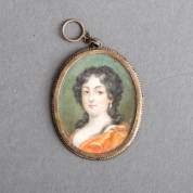 Miniatuurportret: vrouw met zwart haar, aanziend, aquarel op ivoor, gemonogrammeerd CS, 19e eeuw, in 3e gehalte zilveren montuur, 5 x 4 cm