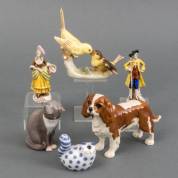 Diverse beeldjes, waaronder: porseleinen kat, uitvoering Bing & Grondahl, Denemarken, keramiek Cavalier King Charles-spaniël, uitvoering Beswick, Engeland, en porseleinen kanaries, uitvoering Goebel, Duitsland, 14 cm