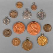 Dertien diverse penningen en medailles van Utrechtse middenstands- en Oranjeverenigingen, twee aardewerk penningen, etc.