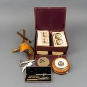 Houten handstereoscoop met een doos met circa honderd stereoscoop-plaatjes, barometer, etc.