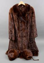 Nerts bontmantel, uitvoering Miner, Amersfoort, daarbij: nerts bontmuts en nerts mof, 123 cm