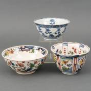 Chinees porseleinen kom met blauw-wit bloemdecor, gemerkt, Kangxi -randchip met gerelateerde haarlijn-, en twee polychroom gedecoreerde aardewerk kommen, uitvoering Tichelaar Makkum, 9,5 x Ø 14,75 cm