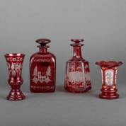 Twee glazen karaffen en twee vaasjes met rood decor in überfangstijl