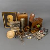Elektrotechnisch therapieapparaat in mahonie kistje, gemerkt D.B. Kagenaar, Mechanicus, Utrecht, genummerd 537, met enig toebehoren, circa 1900, daarbij: menselijk schedeldak, diverse medische objecten, transformator, en ingelijste afbeelding: Socrates