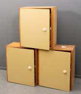 Drie houten kastjes met beigegelakte deurtjes en ronde, crèmekleurige greepjes, uitvoering Bruynzeel -gebruikssporen-, 64 x 55 x 34 cm