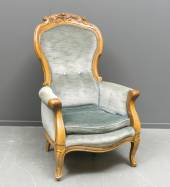 Notenhouten voltaire met gestoken kuif en blauwe velours bekleding, Hollands, biedermeier, 113 x 72 x 88 cm