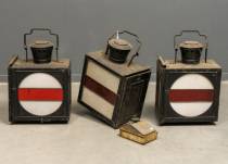 Drie zwart metalen spoorweglantaarns met wit-rode glazen ruiten -gebruikssporen en defecten-, 62 x 37 x 25 cm