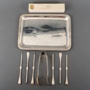 Zes verzilverde kreeftvorken, Hollands glad, Keltum, rechthoekig verzilverd dienblad, Gombault, en een toasttang
