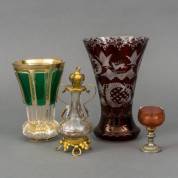 Twee kristallen überfang vazen, flacon met goudkleurig metalen montuur, en glaasje op metalen voet -gelijmd-, 17,75 cm