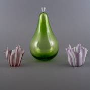 Twee glazen servetvaasjes, Murano, daarbij: groen glazen peervormig object