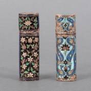 Twee BWZG geëmailleerde kokers met floraal decor, India of Sri Lanka -defecten-, 9 x 3 x 2 cm