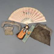 Beschilderde stoffen waaier met benen baleinen, popje met porseleinen hoofdje en ledematen, doosje met griffels, verzilverd maliëntasje, verzilverd maliënbeursje en verzilverde tasbeugel