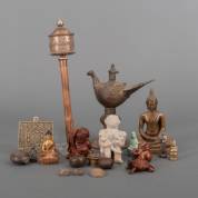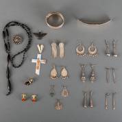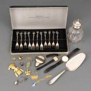 Bijouterieën, waaronder naar precolumbiaans voorbeeld, kristallen flacon met 2e gehalte zilveren dop -dop zit vast, barst-, verzilverde taartschep, en elf verzilverde taartvorkjes
