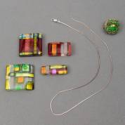 1e gehalte zilveren kettinkje met vier diverse polychrome glazen hangers, daarbij: geëmailleerde en glazen broche, gesigneerd Jacqueline Bobin, Limoges, Frankrijk, 4 x 4,5 cm