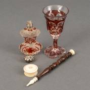 Robijnrood kristallen überfang wijnglaasje, geslepen kristallen parfumflacon met 2e gehalte zilveren dop en robijnrood decor, ivoren pillendoosje, 19e eeuw, en houten breinaaldstop met ivoren details, 19e eeuw -defecten-, 11,5 cm