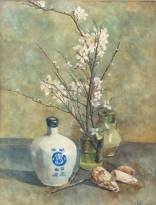 Kees Laan (1902-1975), stilleven met bloesemtak, schelpen en sojafles, aquarel op papier, gesigneerd, 48 x 37 cm