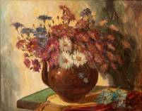 Hollandse School: bloemstilleven met herfstasters in koperen ketel, olieverf op doek, gesigneerd C. Veer, 38 x 48 cm