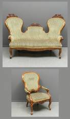 Mahonie vlindercanapé met drie gestoken houten kuiven, bekleed met groen-wit gestreept velours, Willem III, en rijk gesneden mahonie voltaire bekleed met dezelfde stof, Willem III -restauraties-, 111 x 168 x 79 cm