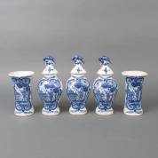 Vijfdelig Delfts aardewerk kaststel met blauw-wit decor van een pijprokend figuur in landschap, pseudomerk voor De Drie Klokken, circa 1900 -één dekselornament gelijmd-, 19 cm