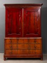 Mahonie tweedeurs kabinet met in de onderkast drie lades, de deuren en laden geflankeerd door gedraaide halfzuilen, Hollands, Biedermeier -onderkast verkleurd-, 224 x 166 x 55 cm