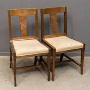 Twee mahonie stoelen met inlegwerk van ivoor, de zittingen bekleed met grijze stof, Amsterdamse School, circa 1915 -enkele stukjes ivoor ontbreken-, 84 x 45 x 50 cm